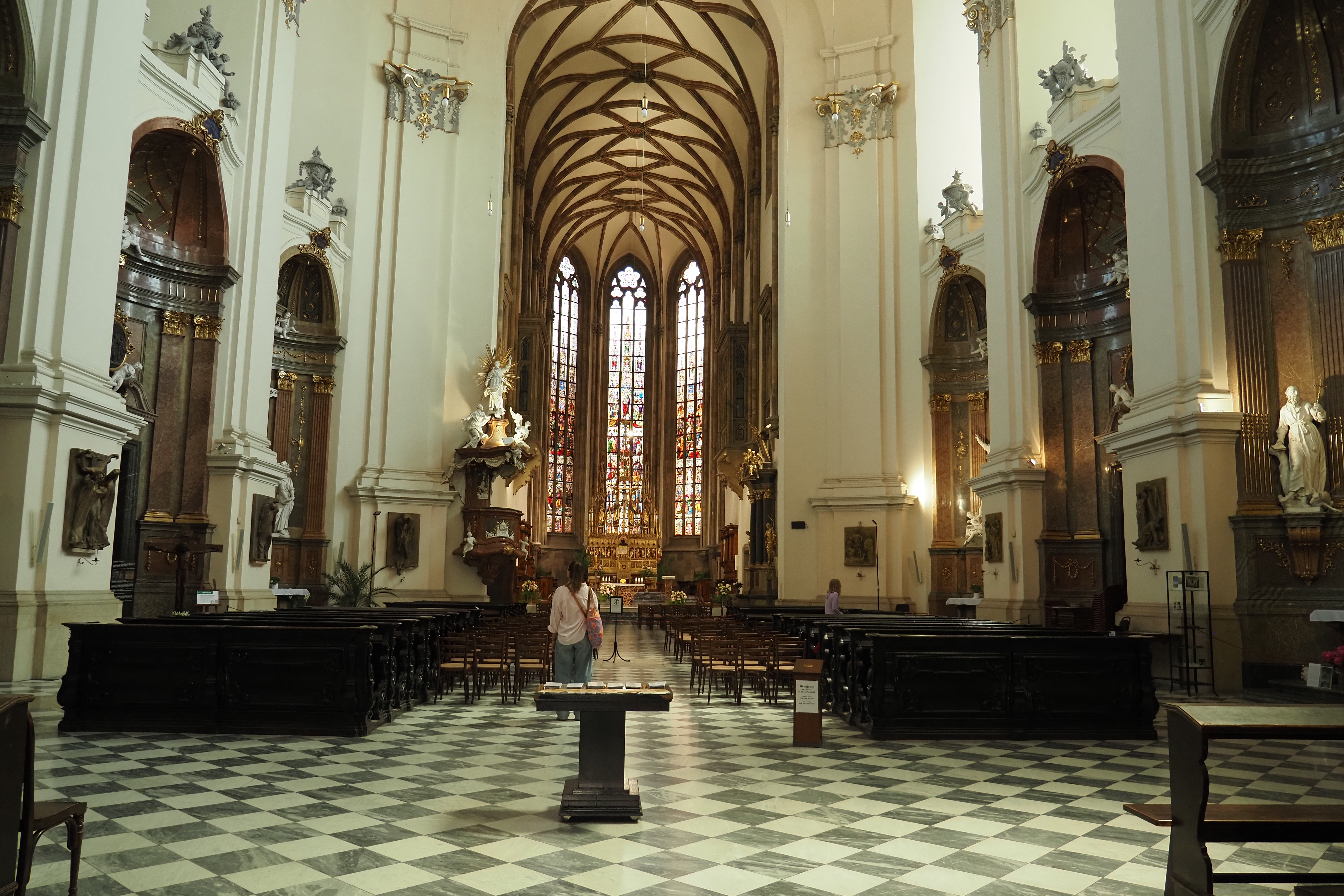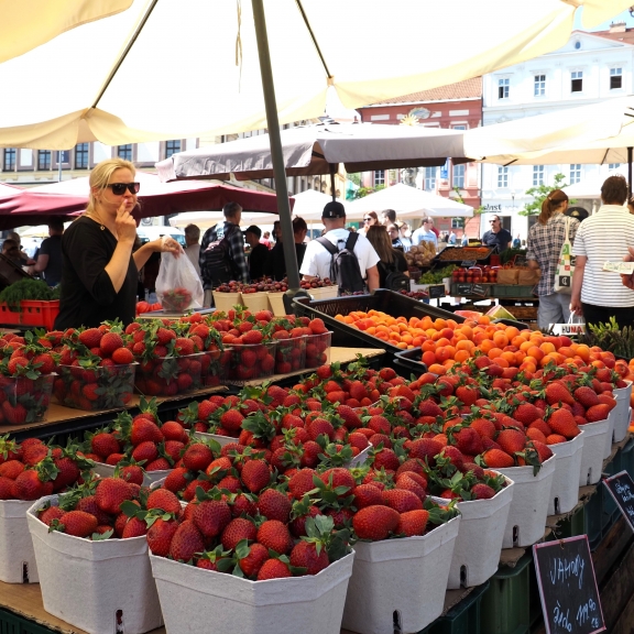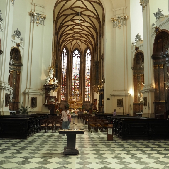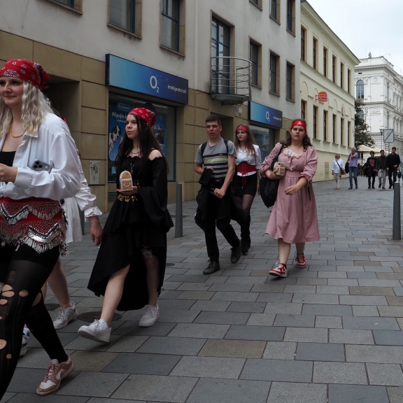 Ker je od hotela do centra mesta le kilometer, smo se proti večeru peš oz. z našimi motoriziranimi pripomočki odpravili na prvi ogled, spoznavanje in orientacijo mesta. Pot nas je od hotela pripeljala naravnost do cerkve svetega Jakoba in si jo ogledali od zunaj, pod njo je druga največja kostnica v Evropi, ki pa se je nismo ogledali zaradi arhitekturnih ovir. Spustili smo se v center starega mestnega jedra (Trg svobode), ki je obdan z zgradbami srednjeveške gospode. Na njem stoji zanimiva črna granitna skulptura, ki spominja na izstreljeno raketo - Astronomska uro, ki simbolizira, zmago nad Švedi. Leta 1645 so Švedi oblegali mesto in obljubili, da se bodo umaknili, če mesta ne osvojijo do poldneva. Pametni meščani so na cerkvene zvonove zvonili že ob 11. uri in tako pretentali Švede. Od takrat zvonovi še danes zvonijo ob 11. uri namesto opoldne.