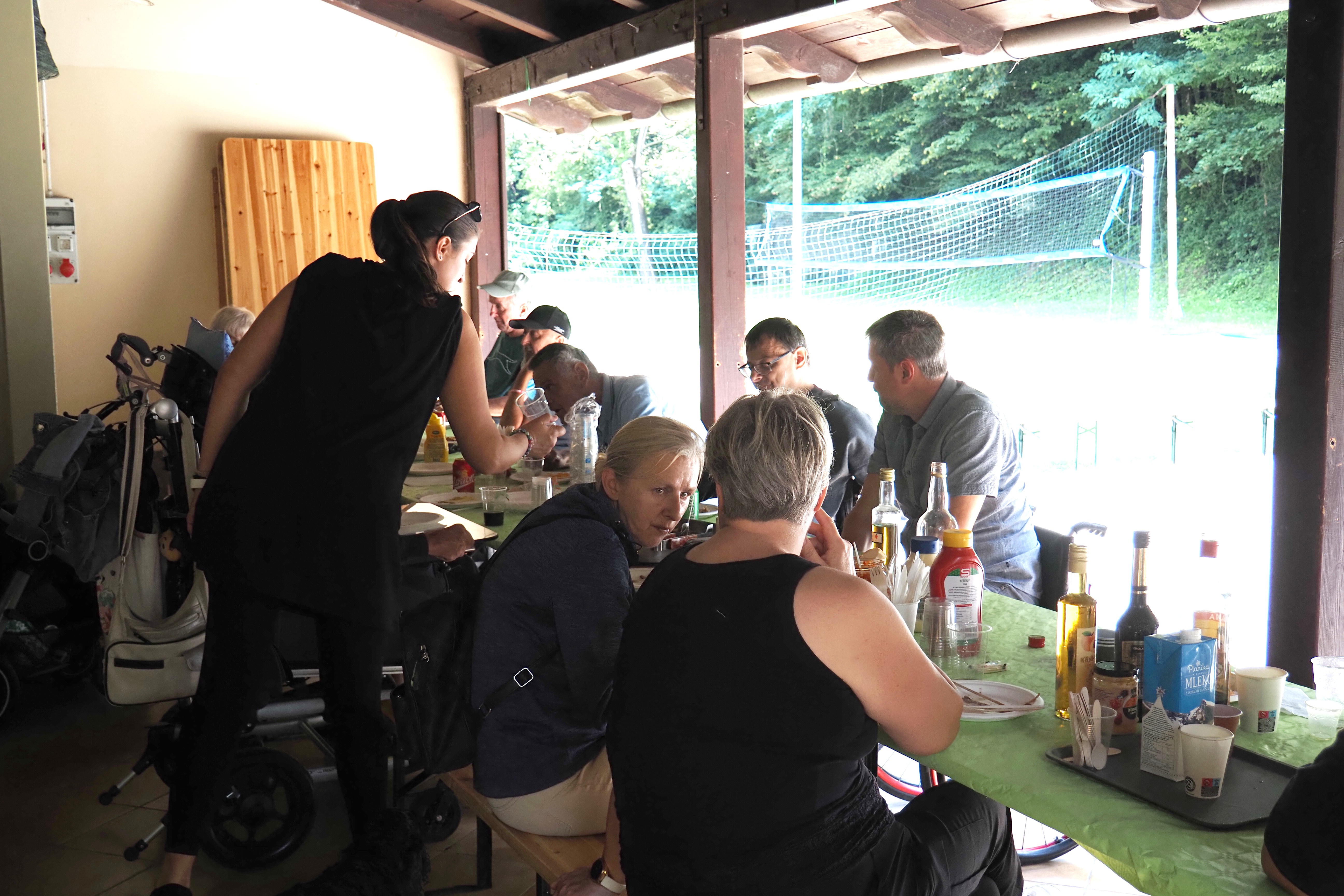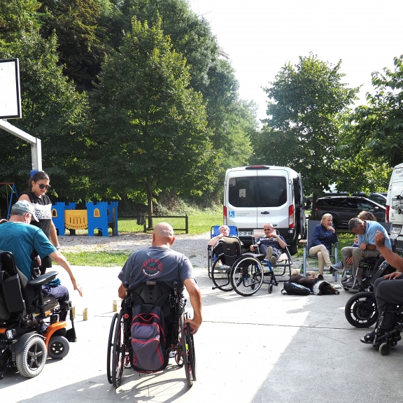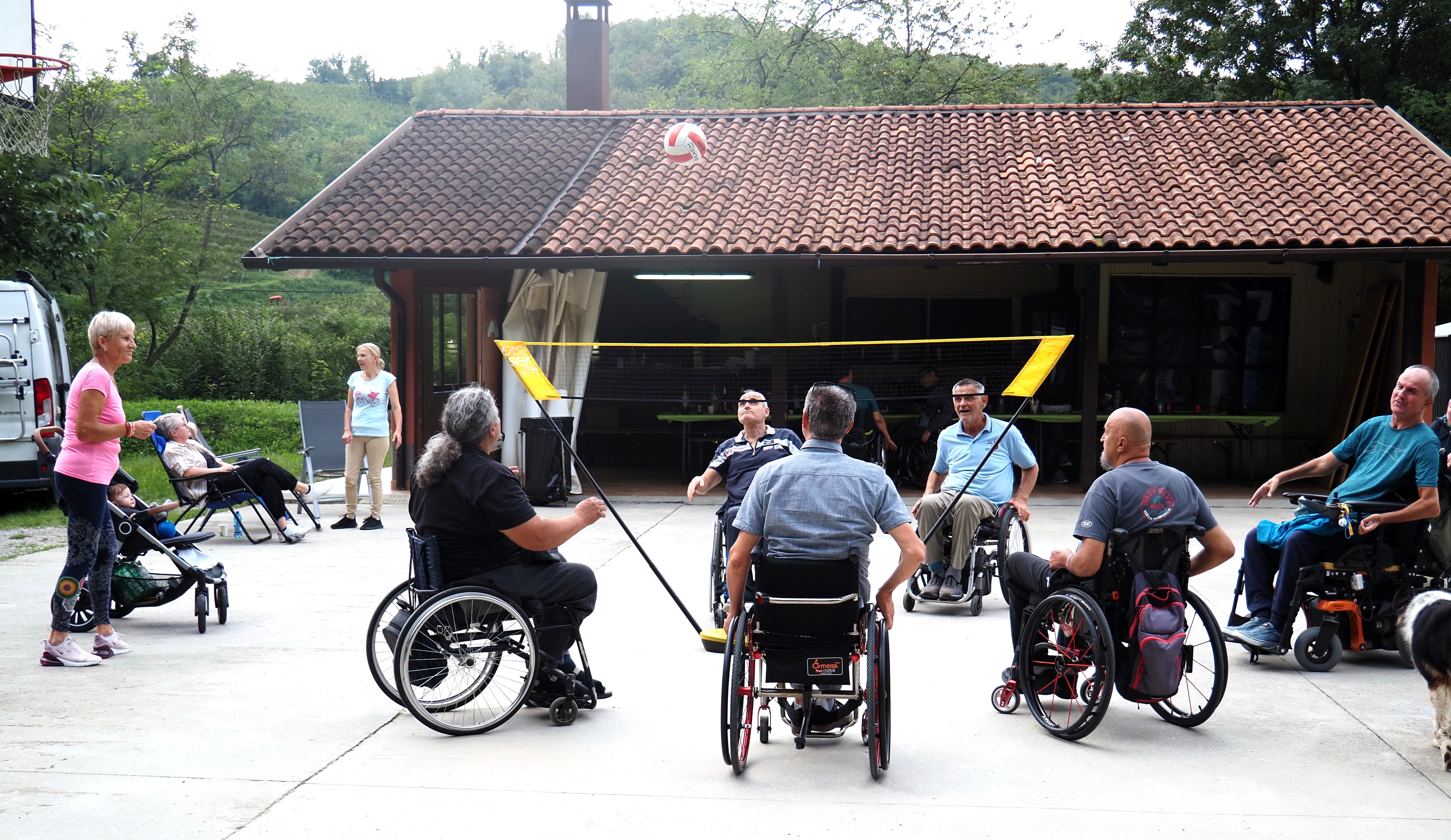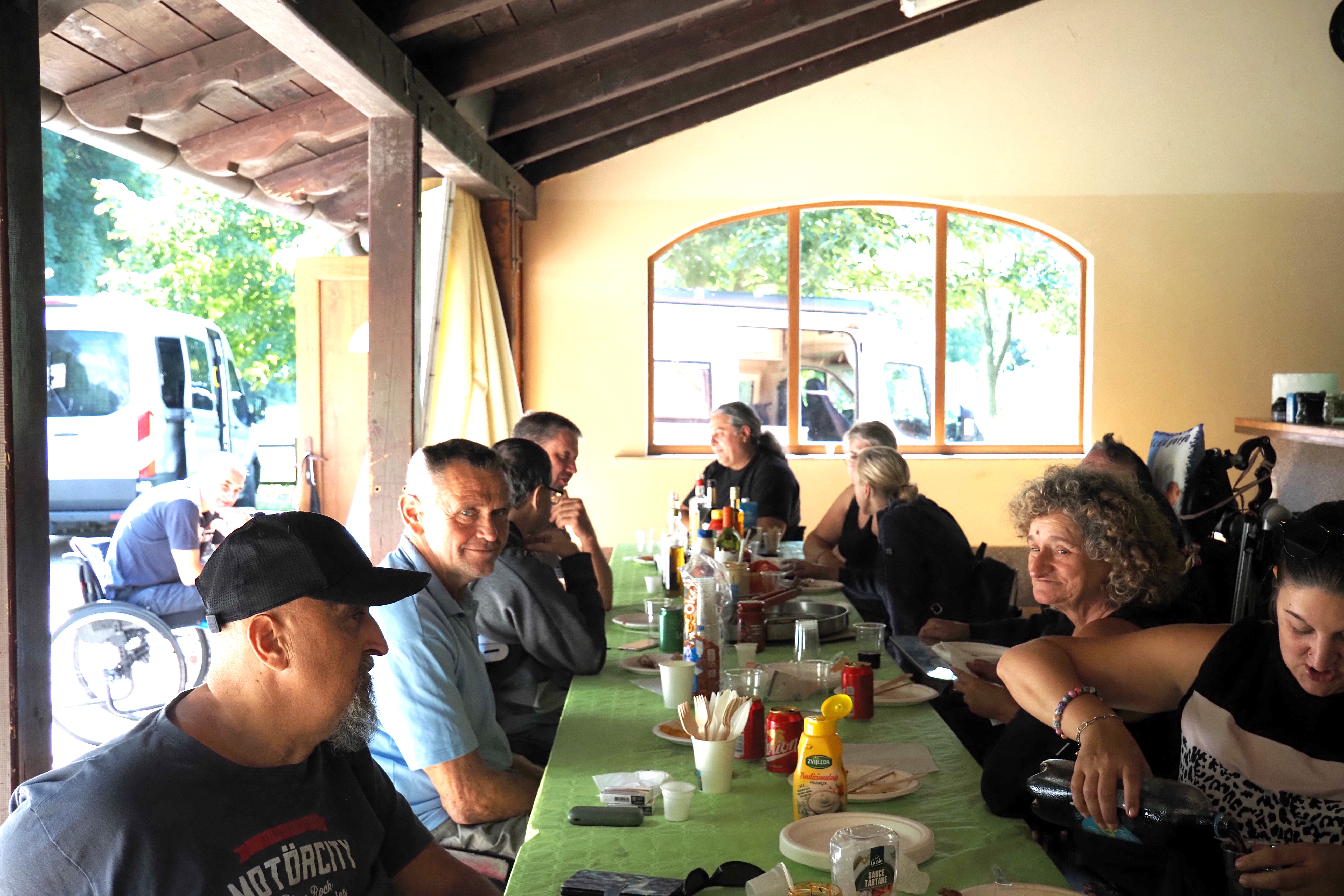 V mirnem kotičku Goriških Brd stoji igrišče »Čelo« kjer smo se zbrali člani Društva paraplegikov severne Primorske na našem jesenskem srečanju. Drugo septembrsko nedeljsko dopoldne ni izgledalo nič kaj obetavno. Temno in oblačno vreme ni kazalo na nič kaj prijeten dan. Vendar tako kot smo se člani drug za drugim počasi zbirali pod nadstreškom našega prizorišča, tako so temni oblaki izginjali in prav kmalu je posijalo sonce, ki je na trenutke tako močno pripekalo, da smo se morali umakniti v senco. Ob kavi, rogljičkih in raznih (beri tekočih) domačih dobrotah, smo se vsi nabrali na kup in že kmalu je zadišalo po žaru. Naš mojster žara se je tokrat odločil za dva hoda, enega opoldne in enega kasneje. To se je izkazalo za dobro odločitev, saj se je bilo po prvem obroku potrebno malce razmigat in pretrest naše polne želodčke, da bi sploh bili pripravljeni na še eno rundo dobrot. Ta čas smo izkoristili za prijeten klepet, tisti ki nam roke kolikor toliko služijo smo se poskusili v igranju odbojke na vozičkih in poskrbeli za obilico smeha, kajti redno smo skrbeli za rekreacijo naših spremljevalcev, ki so neumorno pobirali žogo. Ko smo se utrudili, je prišla na vrsto igra Mölkky, ko z lesenim količkom zbijaš prav tako lesene oštevilčene količke in seštevaš rezultat do končne zmage. Pri tej igri so v ospredje stopili tetraplegiki, ki so se odlično odrezali, kljub nekoliko prirejenim pravilom.