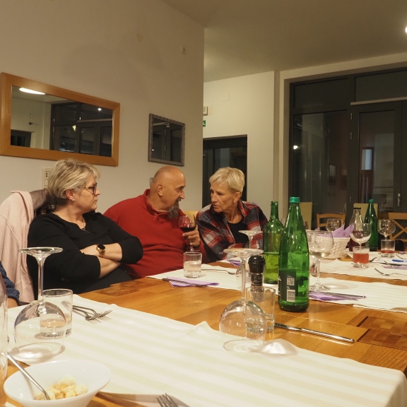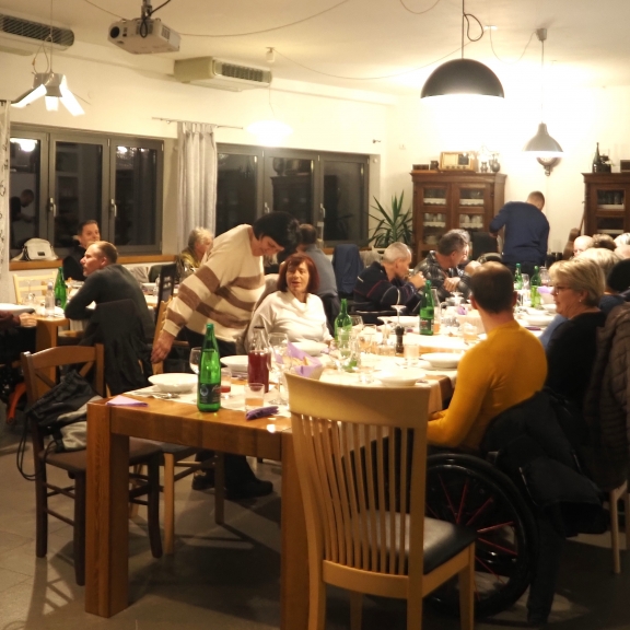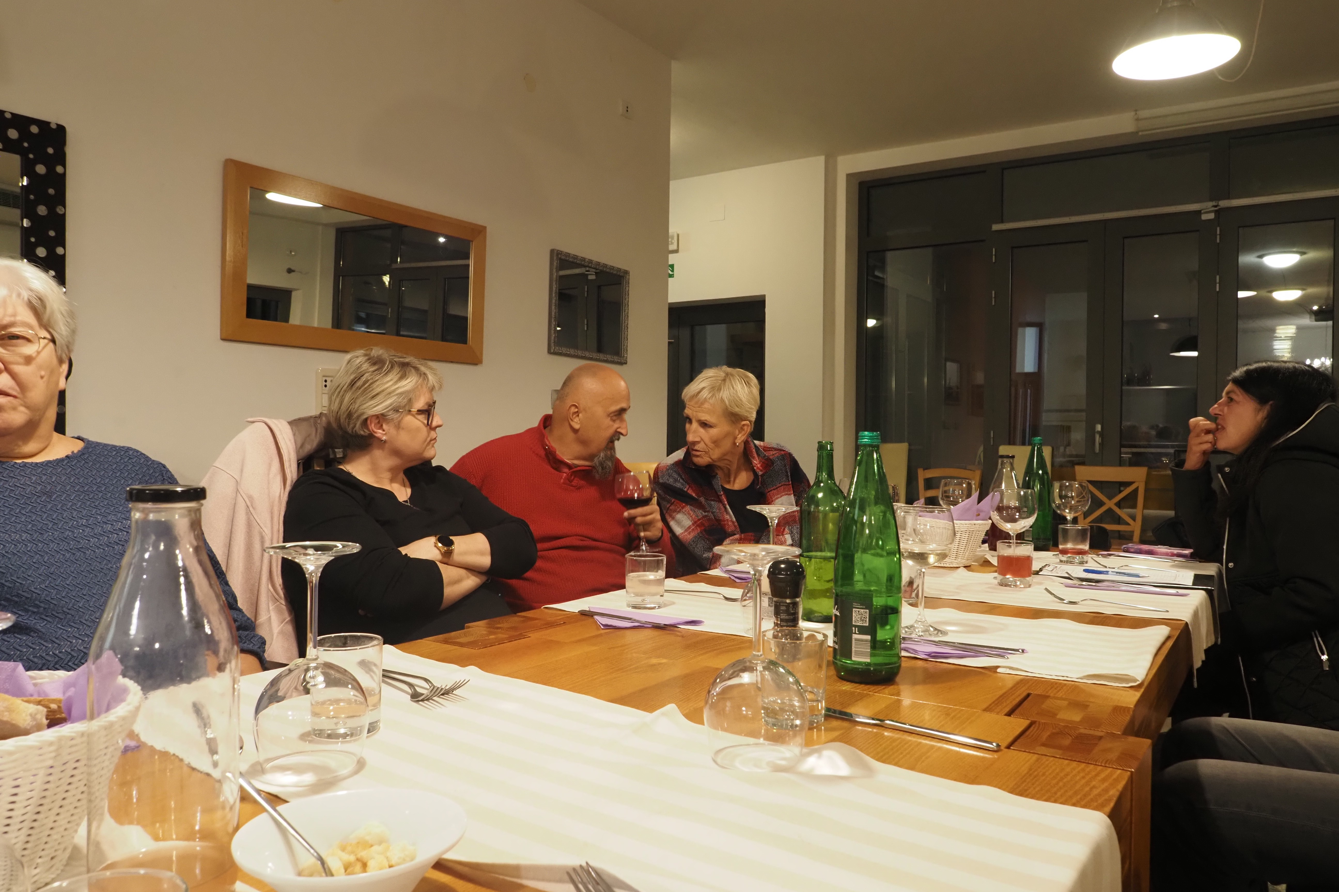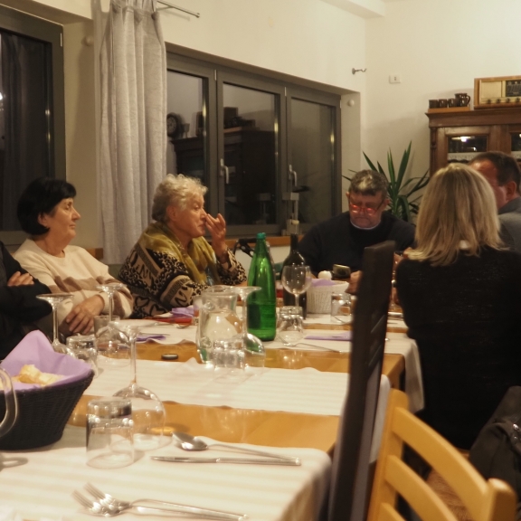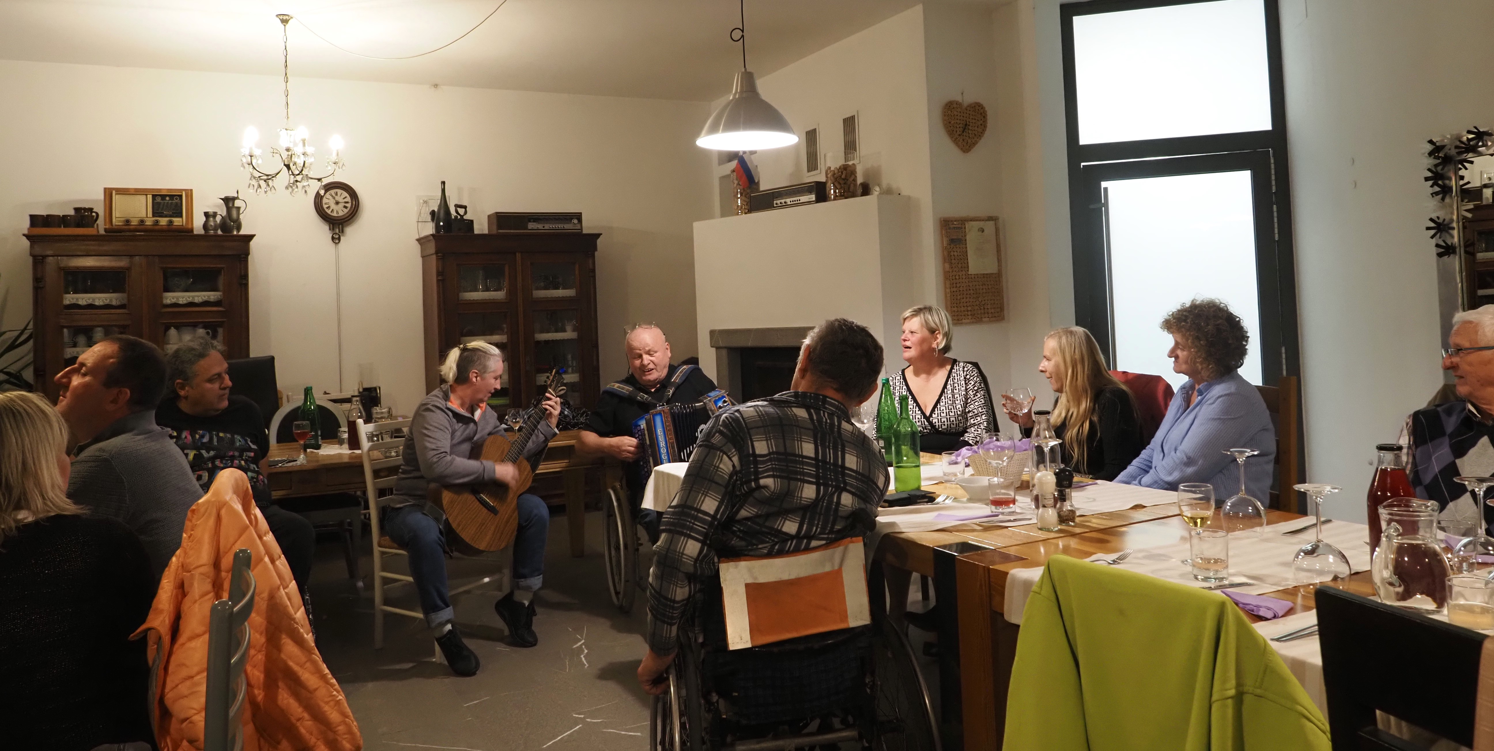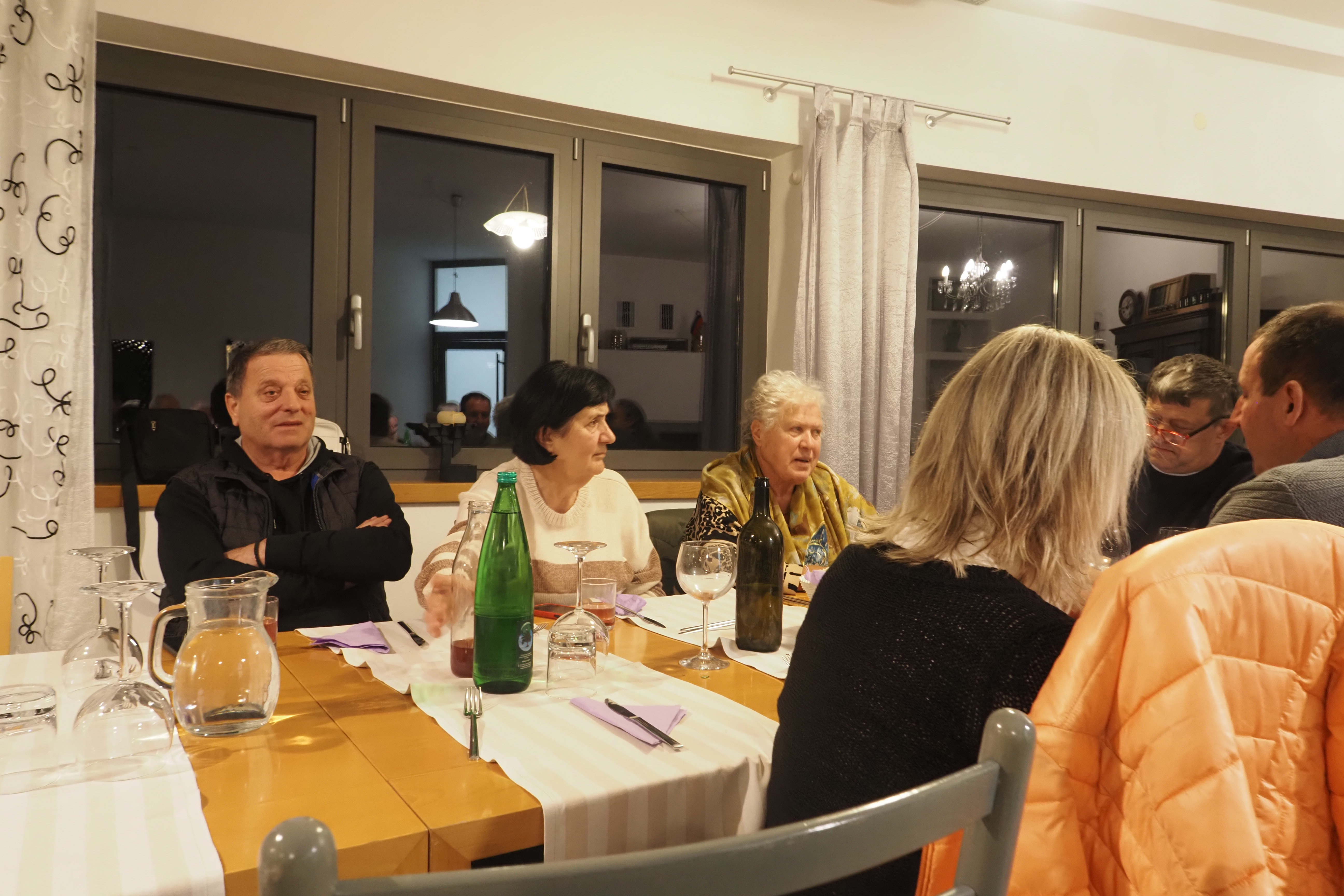 Naše tradicionalno srečanje smo letos, tako kot že nekajkrat preživeli na turistični kmetiji Pr Profesorjevih v Dornberku, kjer smo vedno lepo sprejeti in tudi letos ni bilo nič drugače. Domače suhomesnate dobrote za predjed so se kar topile in izginjale z mize, odlična bučna kremna juha, dve vrsti glavne jedi, goveja pečenka v omaki in pečen janček s krompirčkom, vse zelo dobro, lepo dekorirano in postreženo…. Obvezno je in tudi spodobi se, da tako pojedino poplaknemo z glažem ali dvema domačega vinca. Da nam v premorih med enim in drugim hodom ne bi bilo preveč dolgčas, pa so naši člani – glasbeniki, poskrbeli za veliko pesmi in zabave.