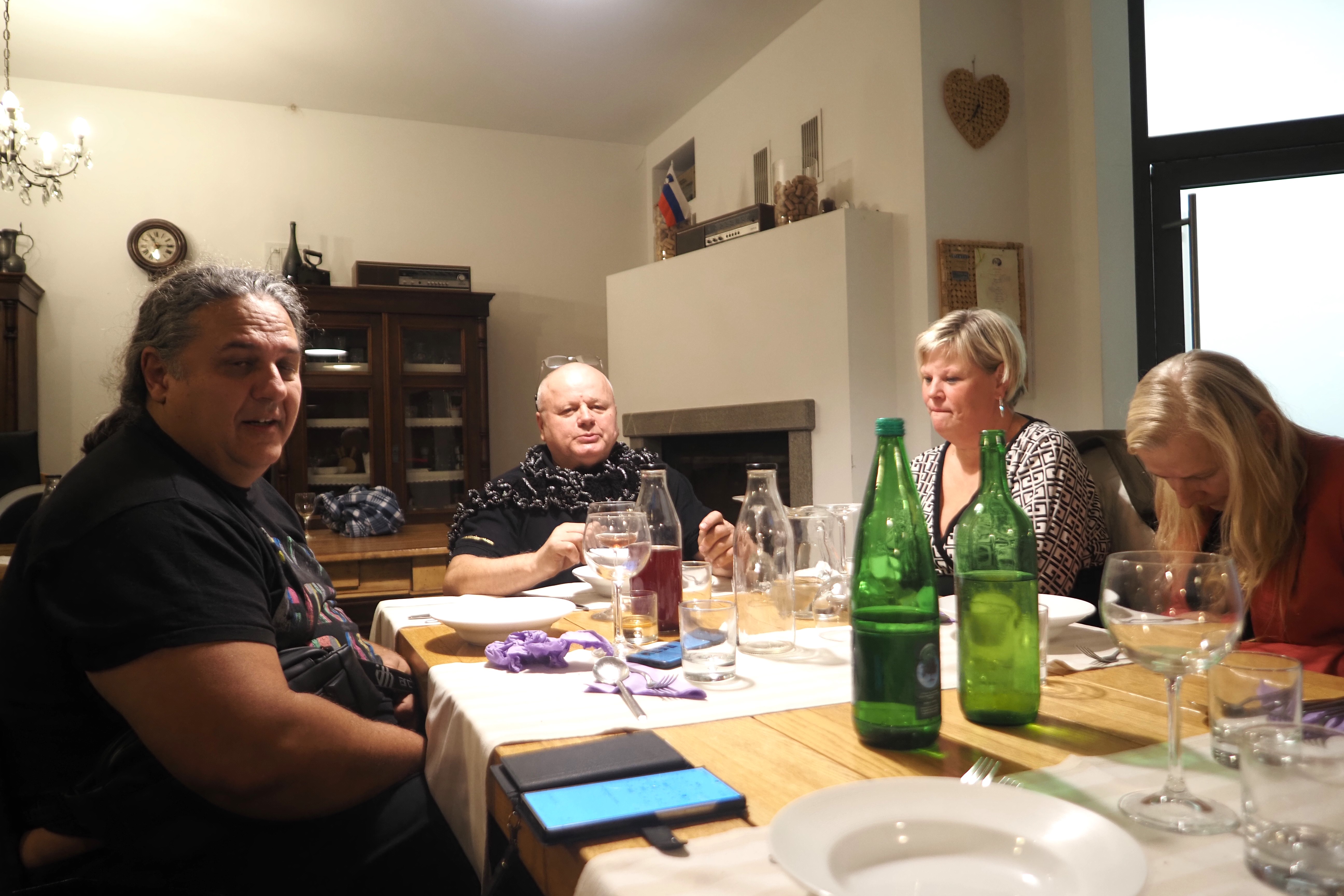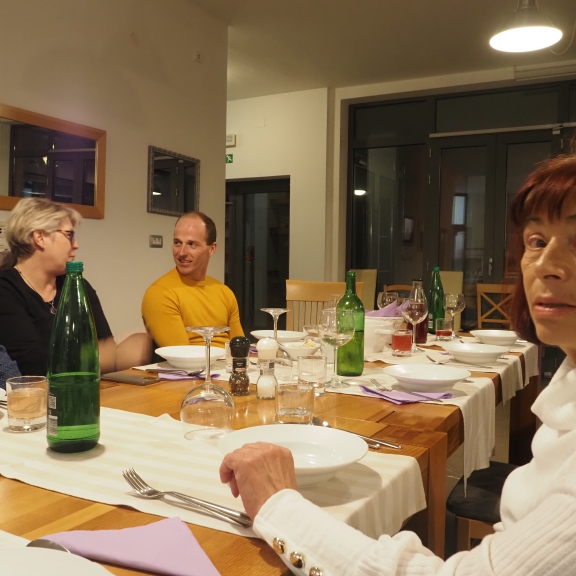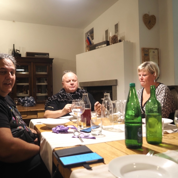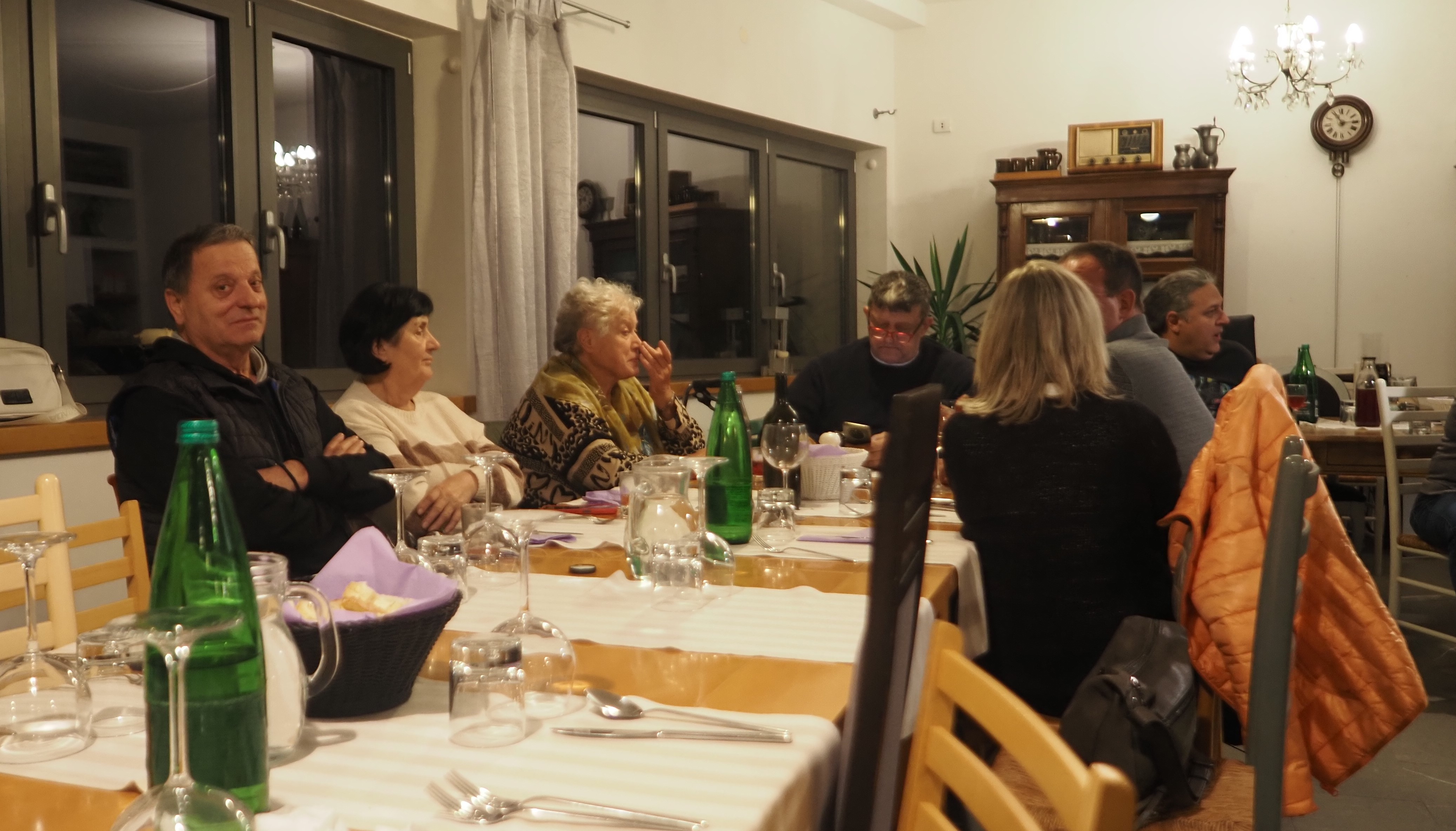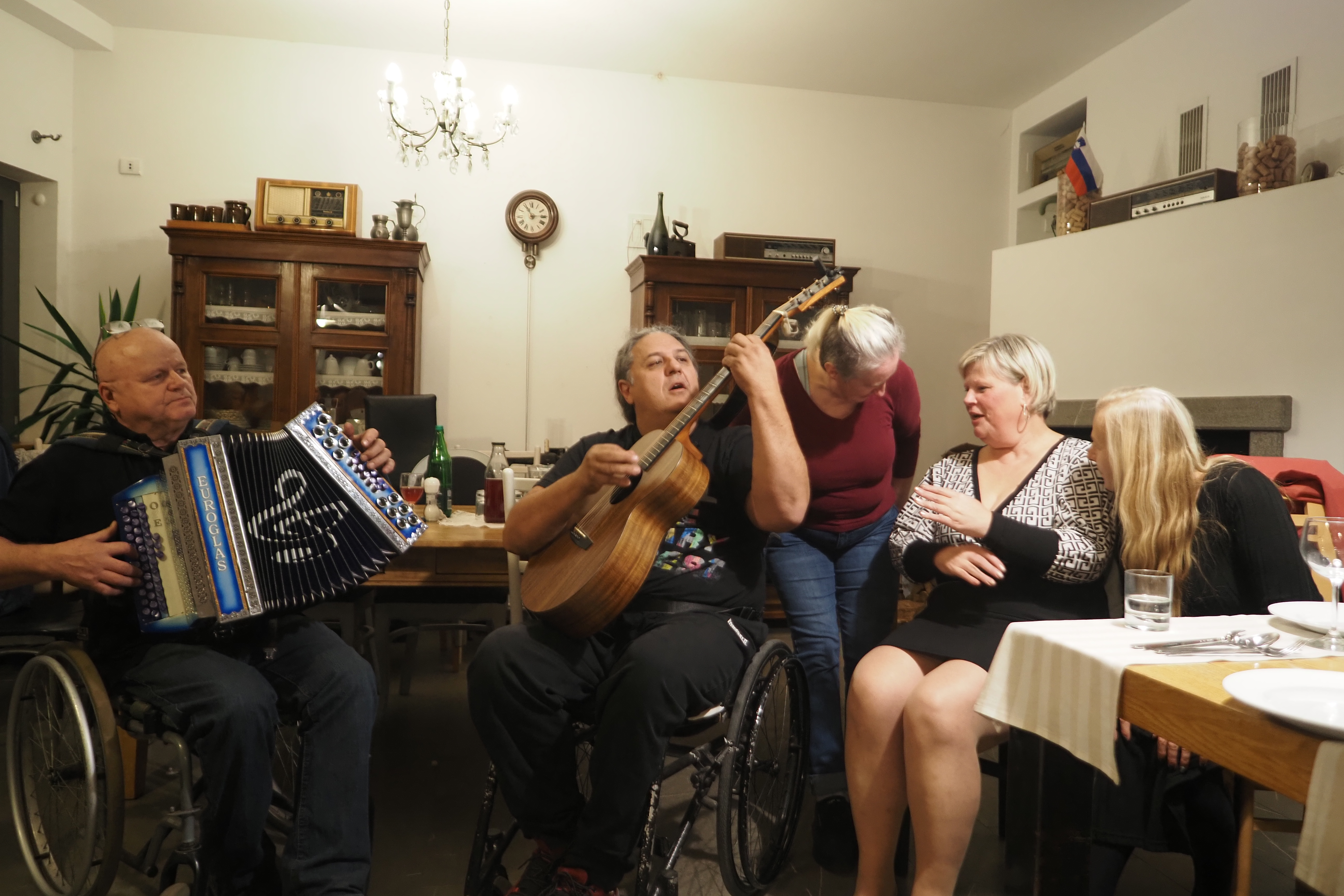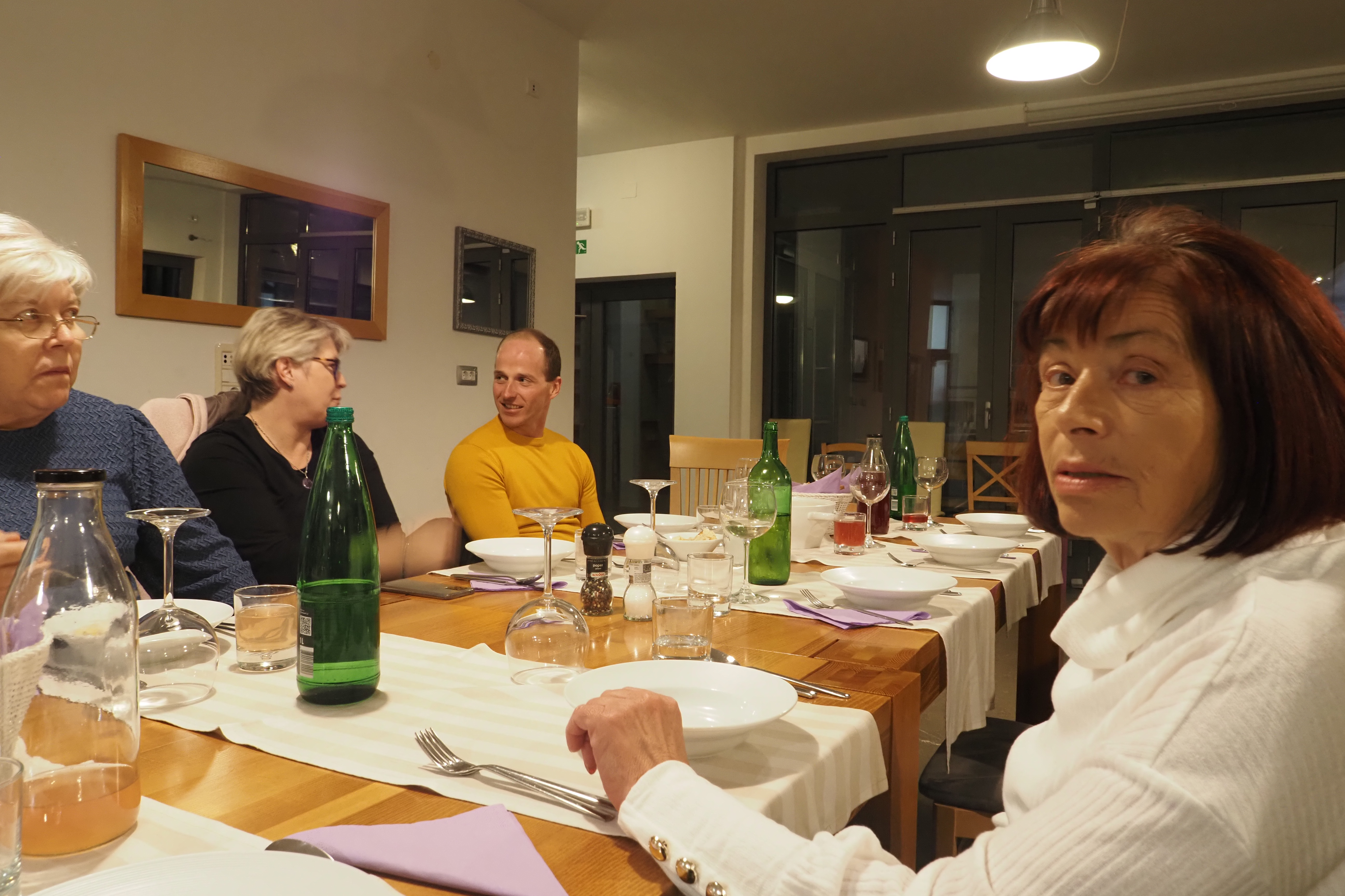 Naše tradicionalno srečanje smo letos, tako kot že nekajkrat preživeli na turistični kmetiji Pr Profesorjevih v Dornberku, kjer smo vedno lepo sprejeti in tudi letos ni bilo nič drugače. Domače suhomesnate dobrote za predjed so se kar topile in izginjale z mize, odlična bučna kremna juha, dve vrsti glavne jedi, goveja pečenka v omaki in pečen janček s krompirčkom, vse zelo dobro, lepo dekorirano in postreženo…. Obvezno je in tudi spodobi se, da tako pojedino poplaknemo z glažem ali dvema domačega vinca. Da nam v premorih med enim in drugim hodom ne bi bilo preveč dolgčas, pa so naši člani – glasbeniki, poskrbeli za veliko pesmi in zabave.