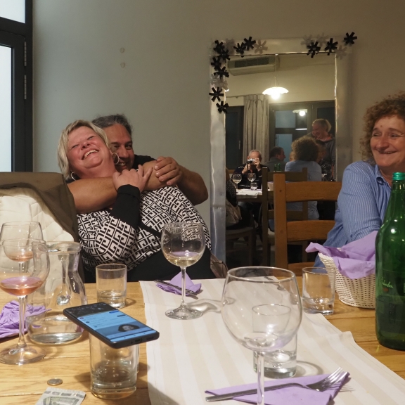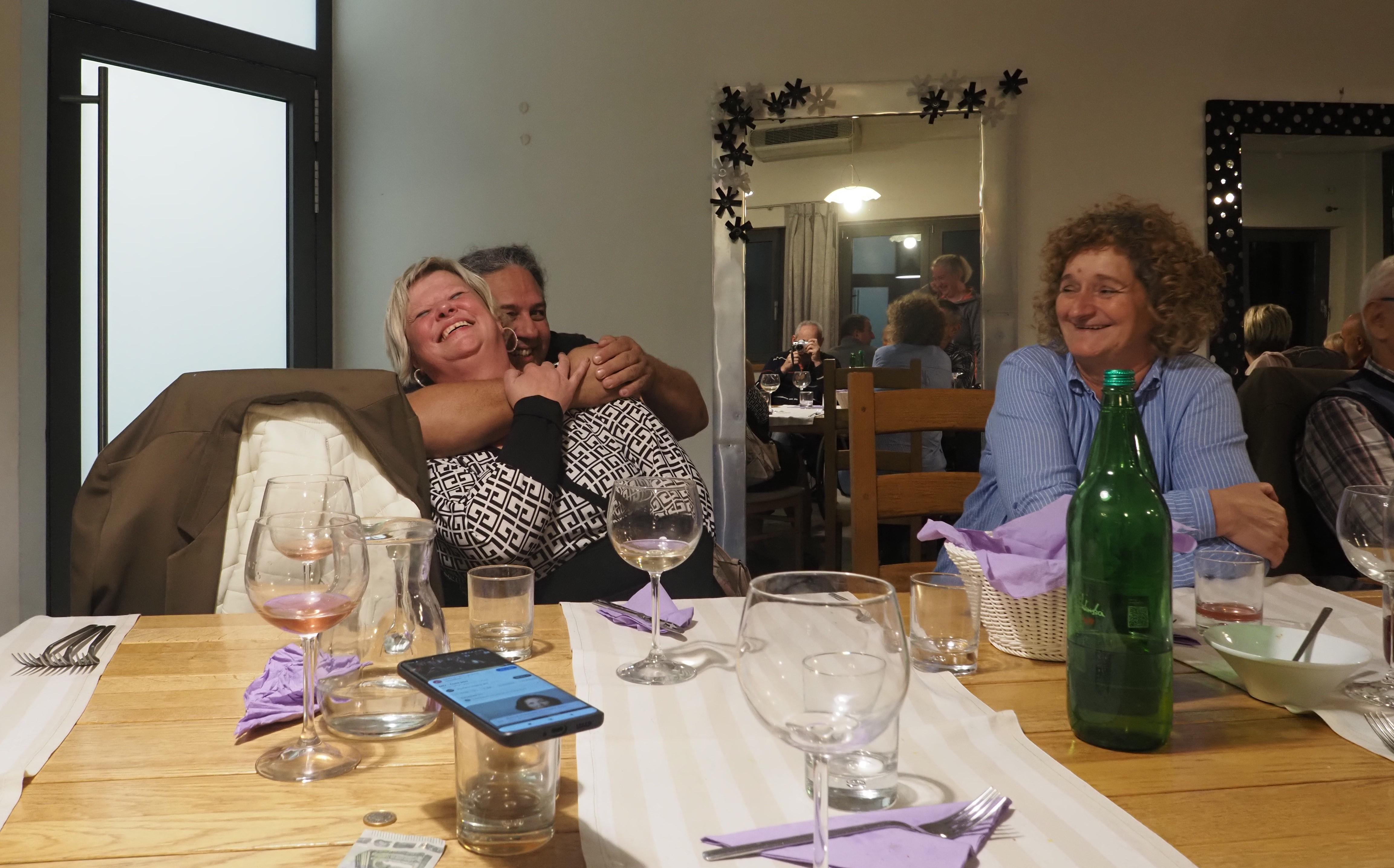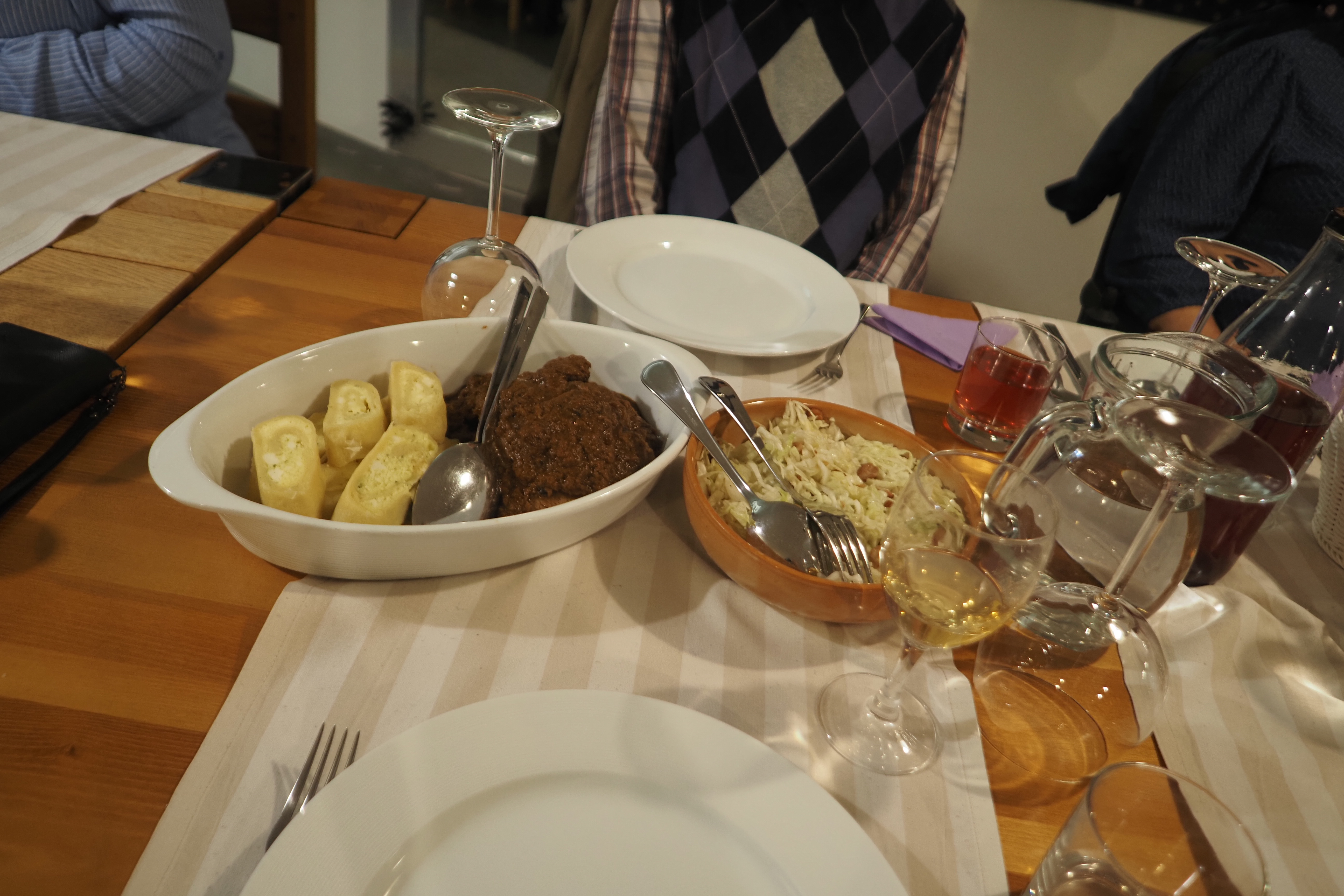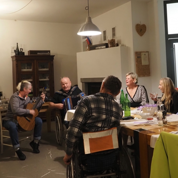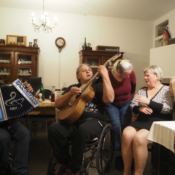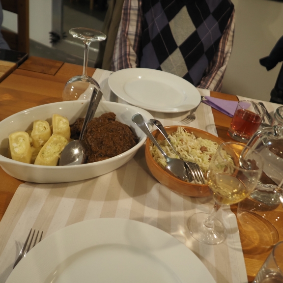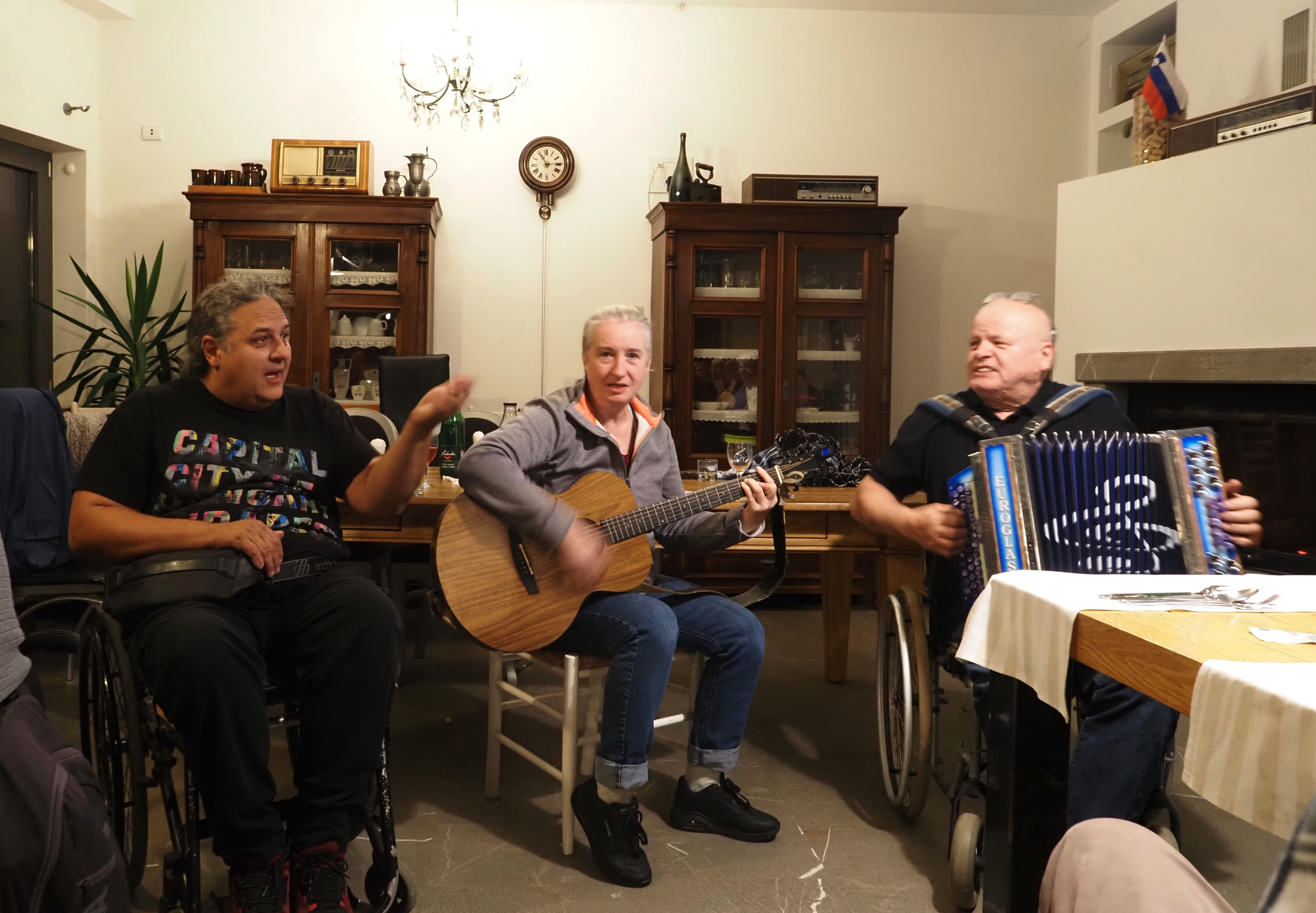 Naše tradicionalno srečanje smo letos, tako kot že nekajkrat preživeli na turistični kmetiji Pr Profesorjevih v Dornberku, kjer smo vedno lepo sprejeti in tudi letos ni bilo nič drugače. Domače suhomesnate dobrote za predjed so se kar topile in izginjale z mize, odlična bučna kremna juha, dve vrsti glavne jedi, goveja pečenka v omaki in pečen janček s krompirčkom, vse zelo dobro, lepo dekorirano in postreženo…. Obvezno je in tudi spodobi se, da tako pojedino poplaknemo z glažem ali dvema domačega vinca. Da nam v premorih med enim in drugim hodom ne bi bilo preveč dolgčas, pa so naši člani – glasbeniki, poskrbeli za veliko pesmi in zabave.